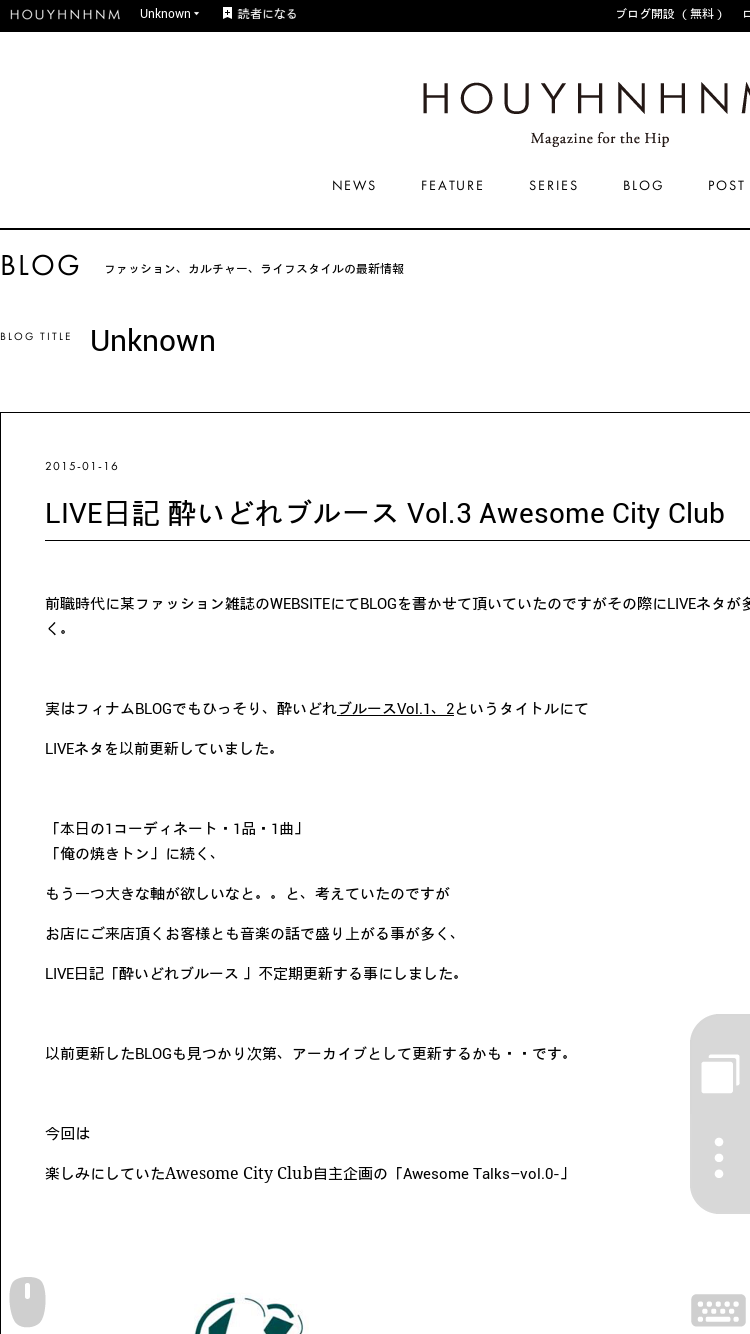 また、ファッションWEBマガジン『HOUYHNHNM(フイナム)』のCREATOR BLOGにて新カテゴリーLIVE日記「酔いどれブルース 」を不定期更新する事になりました。